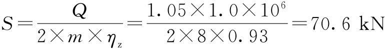 卷筒钢丝绳总拉力:∑S=(Q+Q0)/m×η=(1.05×3.2×105)/4×0.98=85.7kN