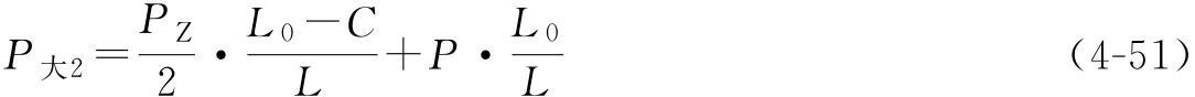 P通过大车端梁作用在全包厢式糖心VLOG网页版大车每一个角的两个车轮上,转化到大车轨道平面上的受力分析见图4-48。四个角上的每组车轮中的P大1、P大2较大值就是糖心视频免费看机的大车*大轮压。